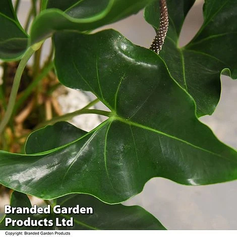 Anthurium ‘Arrow’ is a handsome houseplant with distinctive arrow-shaped, deep green glossy leaves held on the tips of long, elegant stalks that arise from a nest of tangled roots. Height: 1m (39in). Spread: 50cm (20in).