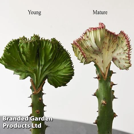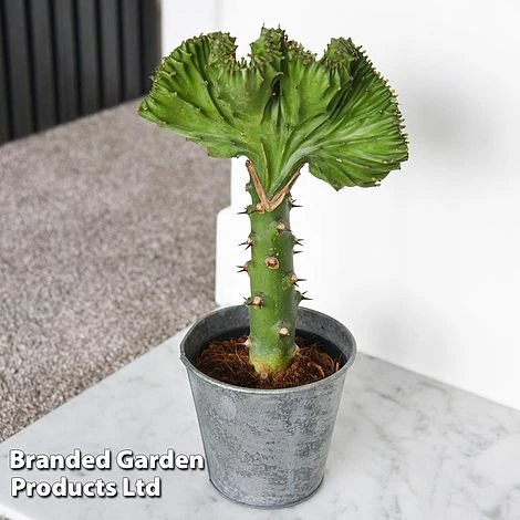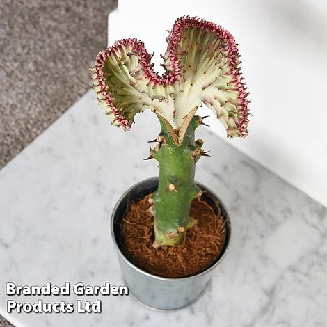 Accent your home with this unusual house plant. Also known as Coral Cactus, this spiny-looking Euphorbia lactea ‘Cristata’ is a low maintenance tender variety which makes a contemporary and easy living feature in the home. The stems are irregular, many of which develop a curved fan shape similar to sea coral. The stems have white marbling and are edged with a contrasting reddish hue which really highlights their unusual, varied shapes. This variety will appreciate a position in your home which received plenty of sunlight. Its undemanding, drought tolerant nature means you only have to water it very occasionally when the soil is completely dry. Height: 35cm (14”). Spread: 15cm (6”).
