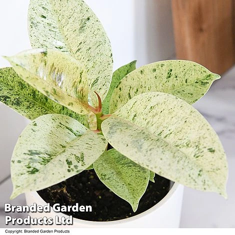 Ficus elastica ‘Shivereana’ is a rarely seen Rubber Plant which features large glossy leaves, splashed and flecked with cream and green variegation. Young leaves are cast with a rosy-pink blush. A distinctive houseplant which makes a bold statement in both form and colour. Maximum height : 300cm (118in). Maximum spread: 100cm (39in).